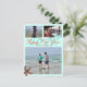 Cartão postal de Ano Novo com tema de praia. Cor azul tropical com texto laranja e espaço para imprimir um endereço de envio. Envie três fotos, com duas imagens menores no topo e uma foto maior na parte inferior. Uma estrela-do-mar marrom decora o canto e a data do ano novo está em números grandes atrás da saudação. Se a temporada de férias passou despercebida, envie um cartão para o ano novo.