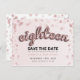 Design de "18ª Festa de aniversário Salvar a Data" elegante com Rosa Dourado Blush Pink Balloon Letters & Glitter confetti e nome personalizado e texto de detalhes. Imprima sua família e amigos com este na moda e design glamouroso. Fácil de usar e fácil de personalizar. Faça o pedido hoje!