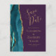 Este elegante cartão-postal moderno para salvar a data apresenta uma borda de ágata em aquarela azul-teal aparada com brilho falso dourado. Personalize facilmente o texto dourado sobre um fundo opulento. O verso repete a informação, junto com um endereço de retorno personalizável.