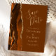 Este elegante e moderno salve a data do cartão postal apresenta uma cor d'água agata tons de borda de laranja queimada e ferrugem, aparada com uma falso brilho dourado. Personalize facilmente o texto dourado sobre um fundo marrom noz. O verso repete as informações, juntamente com um endereço de retorno personalizável.