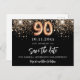 Um Save the Date feminino e moderno para uma festa de aniversário de 90 anos. Um fundo preto decorado com brilho dourado falso. Personalize e adicione uma data e nome, texto. O texto: Salve a Data é escrito com um estilo de letra manuscrita grande e moderno.