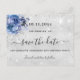 Um Save the Date feminino e moderno para uma festa de aniversário de 50 anos (ou qualquer idade). Um clássico fundo metálico prateado falso decorado com pó de brilho prateado falso e flores azuis. Personalize e adicione uma data e nome/idade. O texto: Salve a Data é escrito com um estilo de letra manuscrita grande e moderno.