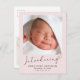 Um cartão postal de anúncio de nascimento de uma menina rosa e simples. A frente apresenta a foto do seu recém-nascido, o nome do cheio, a data de chegada e as estatísticas de natalidade, e "Apresentando" escrito em um roteiro de cinza mole que termina com um coração florescente. No verso do cartão, você pode adicionar uma foto adicional e nomes de pais e irmãos, e um obrigado, uma visita ou outra mensagem.