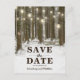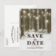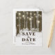Cartões-postais de "Save the Date" do Rustic Christmas Wonderland com um cenário romântico de inverno nevado na floresta, luzes cintilantes, coração talhado no tronco de uma árvore, suas iniciais e um modelo moderno de "Save the Date" de casamento.