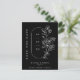 Um casamento moderno salve o cartão-postal com ilustrações desenhadas em linhas brancas de flores floridas de cereja em um fundo preto e um layout moderno de seus detalhes de casamento. Adicione a sua mensagem e o código QR do site de casamento ao contrário.