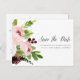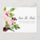 A Elegante aquarela floral salva a data dos cartões postais com a inscrição "salve a data" na caligrafia chica com seus nomes e data de casamento embaixo, acentuada por um buquê exuberante de flores aquáticas em burgundy marsala e rosa-pincelado com folhas e folhagem verdes vibrantes. Cartões postais inversos para mostrar os detalhes adicionais da data, incluindo o site do casamento, com seu endereço de retorno e espaço para o endereçamento do destinatário.