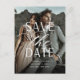 Um cartaz moderno para salvar a data projetado para acomodar sua foto favorita de noivado de sangramento vertical ou orientado a retratos. "Salvar a data" está sobreposta no centro da sua foto em blocos brancos e letras de guião, com seus nomes, data de casamento e local do casamento embaixo. Cartões postais inversos para mostrar os detalhes adicionais da data, incluindo o site do casamento, com seu endereço de retorno e espaço para o endereçamento do destinatário.
