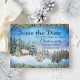 Isto salvou o anúncio da data para a sua festa de Natal mostra uma cena de aquarela de uma cabana na floresta, coberta de neve. Verde-de-inverno, pinheiro, pinho-cones, e bagas vermelhas formam um quadro no topo e no fundo.
