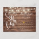 Este na moda para salvar a placa de data apresenta luzes bonito de cordas, um calendário e um coração de amor de ouro chic destacando sua data especial em um fundo de madeira rústica. O inverso tem os detalhes adicionais da data, incluindo o site do casamento, com seu endereço de retorno e espaço para o endereço do destinatário. Projetado por Thisnotme©
