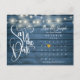 Este cartão de salvação da data estiloso apresenta luzes de corda bonitas, um calendário e um coração de amor dourado chique destacando sua data especial em um fundo de madeira rústica azul.