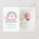 Baby Photo Template Modern Little Wonder Announement Postcard apresenta uma das suas fotos favoritas do seu bebê ou menina recém-nascido com o texto "Little Wonder" em um roteiro de caligrafia com letra rosa e verde, acentuado com um arco-íris e corações amorosos. Adicione informações adicionais, como o nome do seu bebê recém-nascido e a informação sobre o nascimento. Ao contrário, adicione sua mensagem personalizada anunciando a chegada de seu bebê recém-nascido ou uma mensagem de obrigados dos pais e da família. DICA DA FOTO: centralize sua foto antes de carregá-la no Zazzle. Elaborado por ©Evco Studio www.zazzle.com/store/evcostudio