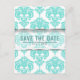 Cartão postal de casamento chic Damask azul turquesa e branco Salvar a data. Personalize com qualquer texto.