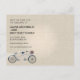 Casamentos com temas de bicicleta são uma tendência divertida nos casamentos temáticos. Neste fundo falso de roupa, exceto o cartão postal, uma bicicleta tandem simboliza o casal casado a andar juntos. O assento da noiva tem um véu de casamento envolto e o assento do noivo tem uma gravata de arco desamarrada ao redor dos guiões. Um buquê de noiva é colocado na cesta da bicicleta. Os nomes dos casais se destacam em uma faixa azul marinho em cima com a data abaixo. Detalhes e outras informações impressão no verso para fazer um alternativo barato para salvar o lançamento da data.Disponível em cores alternativas com uma opção para a bicicleta da noiva e do noivo.