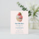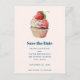 Salve o cartão-postal de data com uma ilustração brilhante com um cupcake delicioso. Sorvete branco e um morango grande adoram este doce doce doce.