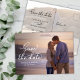 Casamento Romântico De Foto De Script De Na moda Romântico De Orçamento Moderno Salva Os Cartões-Postais De Data. Apresenta uma foto de cheio e uma caligrafia elegante de camada de fotos, escrita com letra maiúscula, com letra maiúscula, em preto clássico e branco, que captura a essência da elegância contemporânea. Perfeitamente para casamentos modernos, o verso oferece personalização perfeita, mostrando uma foto de cheio adornada com uma delicada camada translúcida para a adição sem esforço de suas especificações de casamento. Personalize este cartão com suas amadas fotos e detalhes do casamento, garantindo um anúncio memorável e generoso para sua celebração especial.