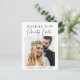 Elemento moderno ou cartão postal de anúncio de casamento menor para que familiares e amigos saibam que seus planos de casamento mudaram, exigindo que você fuja ou reduza o número de convidados no seu casamento, mas que você vai receber uma festa de celebração no futuro. A frente apresenta sua foto e "Casado Agora, Festa Mais Tarde" em uma mistura de simples tipografia e um roteiro chic. Sob sua foto você pode adicionar seus primeiros nomes e a data do casamento. Ao contrário, você pode personalizar sua mensagem em mais detalhes e seus nomes em um script semelhante a assinatura.