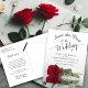 Esses belos cartões-postais são uma ótima maneira de informar aos seus amigos e familiares para salvar a data do seu próximo casamento. O design apresenta uma linda rosa vermelha de haste longa deitada de lado refletindo em uma piscina com ondas e ondulações. O texto apresenta caligrafia cursiva com renda. O verso tem um gráfico fofo que diz "marque-nos" com espaço para uma nota personalizada que pode incluir o site do seu casamento.