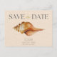 Cartões-postais de save the date econômicos para o seu casamento na praia. Cartões-postais de save the date com um simples design de conchas são personalizados com os detalhes do seu casamento.