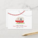 Um casamento inspirado na vintage salve o cartão postal com ilustração de um trailer retrorreflector vermelho com cheio de margaridas e suspensões de olhos negros. Vermelho e cinza no topo. Personalize o texto com suas informações.