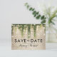 Cartões-postais mágicos de conto de fadas para salvar a data com um fundo de parede de tijolo de pedra rústica, videira de hera verde com luzes cintilantes e um modelo de casamento moderno.