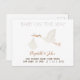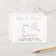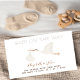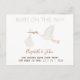 Um anúncio de gravidez com ilustração de cegonha fofa dizendo que um bebê está a caminho.