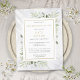 Um convite elegante de celebração de vida com cartão postal com folhagem de verde botânica em aquarela sobre um fundo de mármore cinza. Criado por Thisisnotme©