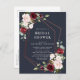 Moderna e moderna, este design de convite para cartão postal de chá de panela apresenta uma geometria falsa de cobre embelezada com água de cor eucalipto verde e arranjos florais burguentos e cor-de-rosa, sobre uma moderna textura azul marinho. Perfeito para noivas modernas! Convidados Elegantes de Direitos Autorais. Todos os direitos reservados.