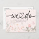 Casamento floral chico salve o cartão postal que diz "nós" com coração conectado. Informações pessoais no fundo.