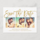 Este elegante e moderno cartão postal de 3 fotos, salva a data, contém uma bela letra de pincel em ouro. Visite o compro para ver o resto da coleção da suíte Dourada de Tipografia Chic.