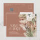 Convite de cartão postal para salvar a data do casamento botânico floral boêmio natural moderno de celeiro rústico com grama de pampas e eucalipto. Floral em aquarela elegante e sofisticada em tons de terracota, verde sage, creme natural e preto. Espaço no verso deste cartão de salvar a data do casamento econômico para informações e código QR com todos os detalhes do seu casamento.