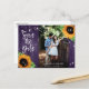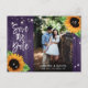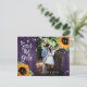 Cartões postais de anúncio de data de casamento com flores rústicas com girassóis e luzes de corda em um fundo de madeira de celeiro. Design de cartão ideal para uma festa de casamento roxa rústica inspirada em girassóis. Cartão postal de anúncio de data de casamento com monograma.