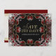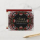 Elegante desenho decorativo em cartões postais de anúncio de data de casamento ou noivado em vermelho profundo e cetim prata. Cartões de casamento acessíveis sem comprometer o estilo e o design.