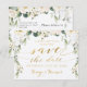 Cartão postal de anúncio de casamento rústico com peônias brancas e folhagens prateadas.