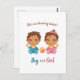 Bebês de desenho animado fofos, menino e menina, em macacões azuis e rosa e babadores amarelos segurando chocalhos combinando.