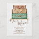 Cartão postal de anúncio de mudança de mala antiga com conjunto de malas em azul aguado e marrom.