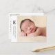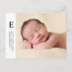 Compartilhe facilmente as suas notícias entusiasmantes com este cartão postal de anúncio de nascimento de fotografias. Na frente do cartão, uma foto quadrada grande é exibida. À esquerda da foto, você pode adicionar o primeiro nome inicial, o nome do cheio e as estatísticas de natalidade do seu recém-nascido. A parte traseira do cartão-postal inclui espaço para gravar uma mensagem pessoal para os destinatários.