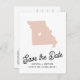 Enviar um cartão de data para salvar seu noivado! Casamento de Destino de Estado MISSOURI moderno salve a data com a silhueta de Estado MISSOURI em cor-de-rosa pincelado com coração, salve a data em uma fonte contemporânea e seu nome e data de casamento ao longo da base. Na parte traseira, um espaço para uma mensagem personalizada e seu endereço de retorno. Clique no botão "personalizar" para mover o coração para o local da sua cidade!!! Todo estilo de texto, cores, tamanhos também podem ser modificados para ajustado das suas necessidades. ESTADO E COR DO CORAÇÃO SÃO EDITÁVEIS! Para obter ajuda ou solicitação personalizada (sem encargos), entre em contato conosco em citronelladesign@gmail.com ou visite nossa loja