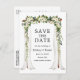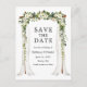 Elegante Cartão Postal De Anúncio De Casamento E Noivado Com Dosel De Casamento Aquarela Verde Branco Inclui belas rosas brancas e peônias brancas. O arco de dossel de casamento de madeira inclui folhagens botânicas.