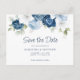 Elegante floral aquarela azul poeirento, branco e buquê floral azul-marinho cartão postal de save the date de casamento. O cartão apresenta um "Save the Date" em letra cursiva, que pode ser alterado para um tipo de letra de sua escolha disponíveis aqui quando você clicar no botão "Personalizar".