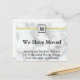 'Mudamos' aparece em texto preto negrito no centro deste anúncio com aparência de mármore branco. Dentro de um pequeno quadrado no topo do adesivo, você pode personalizar seus cartões de mudança de endereço com seu monograma. Na parte inferior, você pode indicar sua mudança de endereço com seu nome e novo endereço.