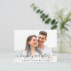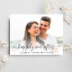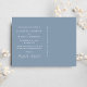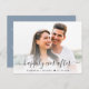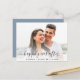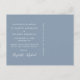 Chic empoeirado azul salve o cartão postal do anúncio da data. Sua foto está sobrecarregada com "feliz para sempre" em um roteiro elegante com sucos e seus nomes e data de casamento são unidos por um coração. Personalize sua mensagem de salvamento em tipografia branca elegante no verso e adicione seus nomes em um script semelhante a assinatura.