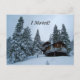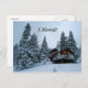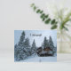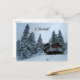 Personalize este cartão postal. Altere o texto, a cor ou adicione a sua própria mensagem! Uma cabana na neve, cercada por pinheiros altos nevados. Fotografia de Minerva Bloom.