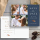 Casamento De Colagem De Foto De marinho Azul Salva O Cartão-Postal De Anúncio De Data. Este elegante e rústico cartão postal de salvamento apresenta cores d'água queimadas manualmente laranja e folhas de terracota em um fundo azul marinho com uma colagem fotográfica de três imagens para personalização.