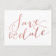 Glamor de Folha Rosa Gold Impressa | Casamento Salve nosso Cartão-Postal de Data. Elke Clarke © Outras cores disponíveis em www.zazzle.com/monogramgallery. Um simples, mas versátil, guião manuscrito de rosa ouro salva a data para casamentos ou outras ocasiões especiais, como jantas de ensaio, chás de casais, comemorações de aniversário de casamento. Folha de rosa dourada é um efeito fotográfico impresso.