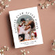 Convite moderno e elegante para casamento íntimo ou anúncio de casamento e recepção para informar familiares e amigos de que você se casou em uma cerimônia pequena, e convidá-los agora para uma recepção de casamento. A frente apresenta sua foto do dia do casamento em uma moldura arqueada e "Festa Feliz para Sempre" em tipografia elegante. Sob sua foto, você pode adicionar seus primeiros nomes e data do casamento. No verso, você pode personalizar sua mensagem em mais detalhes e adicionar detalhes da festa ou recepção e seus nomes em uma caligrafia semelhante a uma assinatura.