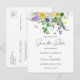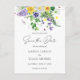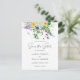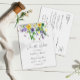 Este é um simples e rústico cartão postal de salvar a data de casamento com flores silvestres. O design apresenta uma variedade de flores silvestres da primavera, incluindo narcisos amarelos, pensées roxas, trevos, lavanda, ervilhas-de-cheiro, dentes-de-leão, tulipas e folhagens de feto e hera. Também inclui algumas joaninhas, uma libélula doce e uma mensagem personalizada no verso.
