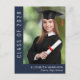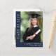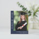 Cartão postal de convite de formatura azul escuro simples e elegante com tipografia branca moderna. A frente apresenta a foto do graduado, o ano da turma e o nome e a escola dele ou dela. No verso, adicione uma foto adicional, uma mensagem de congratulações e uma mensagem mais pessoal, como os planos futuros do graduado.