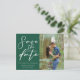 Este cartão postal de salvar a data de casamento verde esmeralda sólido apresenta letra cursiva branca clássica para um casal que se casa em uma floresta ou outro local natural. Personalize com sua foto de noivado de casal favorita. Celebre seu amor com esta cor tranquila e coordene com nossa coleção de tipografia minimalista correspondente.