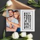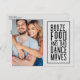 Prepare-se para fazer seus convidados rirem com o nosso divertidíssimo cartão-postal de anúncio de casamento "Save the Date" com foto engraçada! Este cartão charmoso e atrevido apresenta sua foto favorita e uma mensagem hilária que diz: "Bebida, comida e passos de dança ruins".