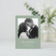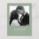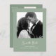 Este simples e na moda, casamento verde sábio salva os cartões postais que contêm a tipografia de um script estilo de vitória, branco, com sua foto e um código de QR digitalizável para seu site de casamento ou detalhes.